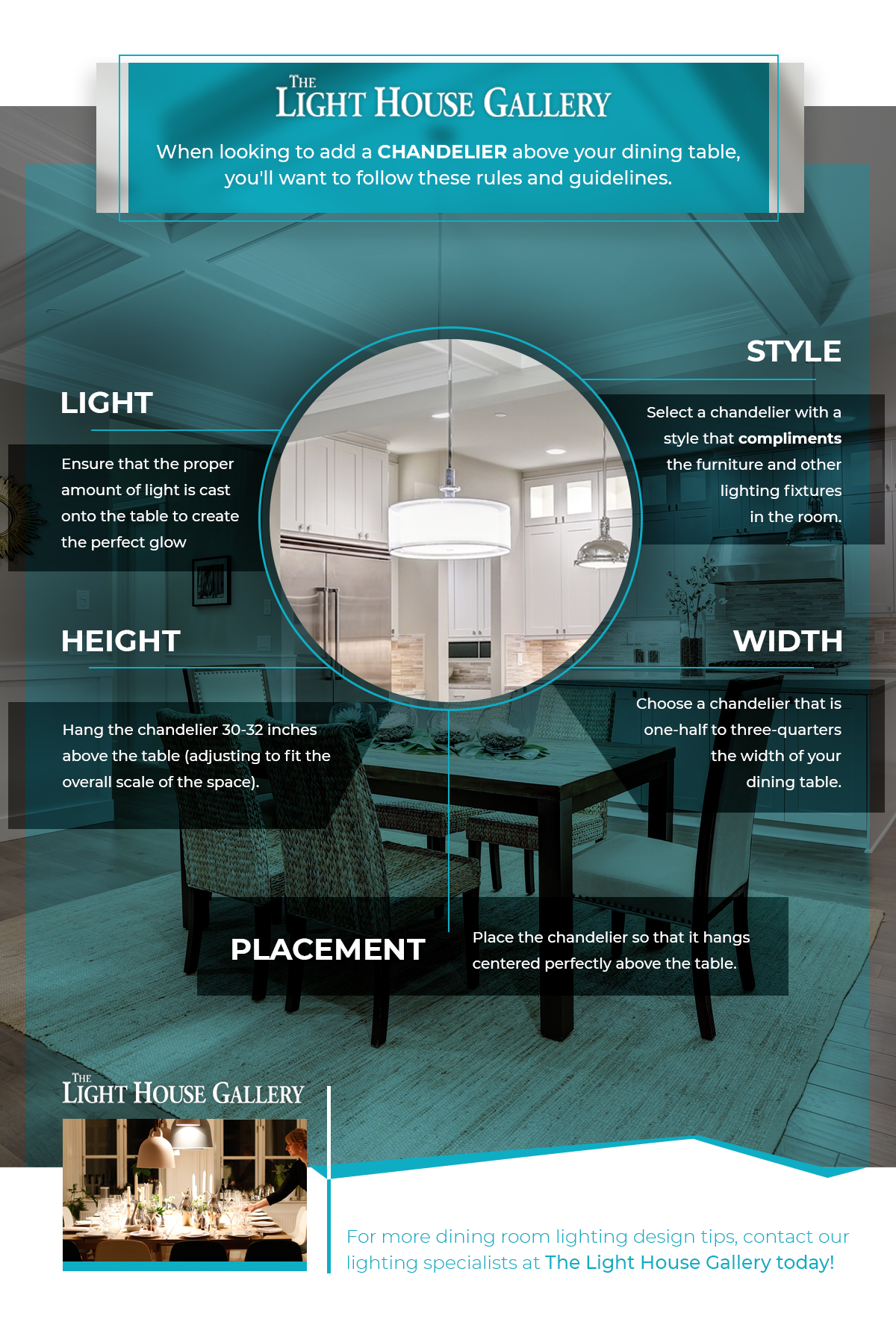 When it comes to your dining room, there often aren’t as many layers of lighting as some other rooms in your home, but the lighting design still requires some planning to ensure the space is functional for the variety of activities that it will need to host. At The Light House Gallery, we focus on three main areas of lighting for your dining room.